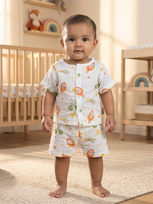 Biglilpeople Unisex Multicolor Rocket Print Round Neck Short Sleeves Clothing Set