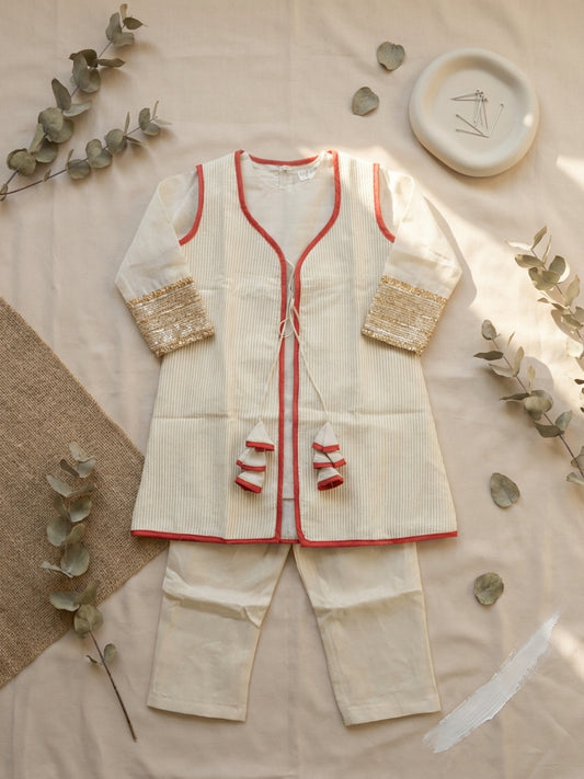Biglilpeople Infant Boys Off-White Kurta Pyjama Set with Striped Nehru Jacket