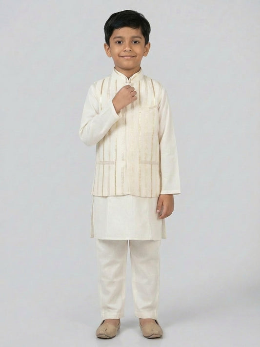 Biglilpeople Boys Off-White Kurta pyjama set with Nehru Jacket