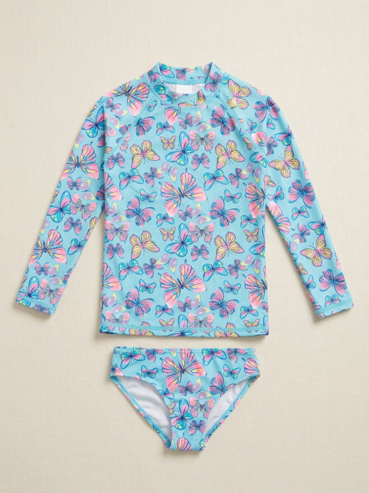 Biglilpeople Girls Aqua Butterfly Print Round Neck Long Sleeves Two-Piece Swimsuit Set