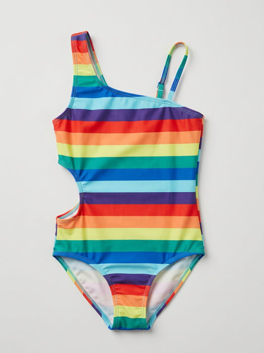 Biglilpeople Girls Multicolour Striped One-Shoulder Neck Sleeveless One-Piece Swimsuit