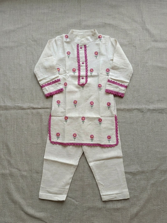 Biglilpeople Girls Off-White Hand Embroidered Straight Kurta Pyjamas Set