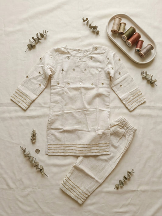 Biglilpeople Infant Girls Off-White Mirror Work Straight Kurta & Pyjamas Set