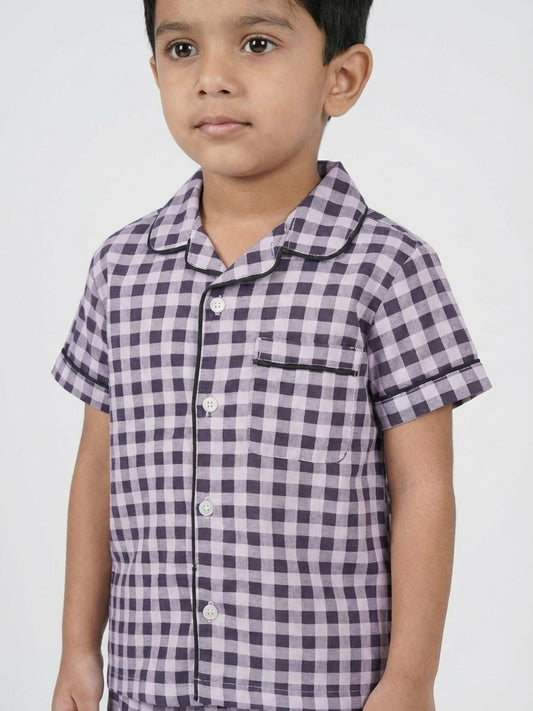 Biglilpeople Boys Black & Purple Checked Pure Cotton Short Sleeves Shirt & Shorts Nightsuit