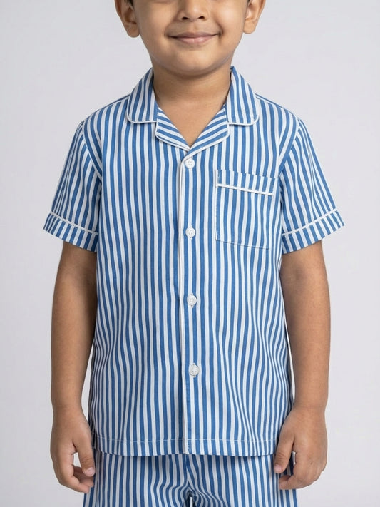 Biglilpeople Boys Blue & White Stripe Pure Cotton Short Sleeves Shirt & Shorts Nightsuit