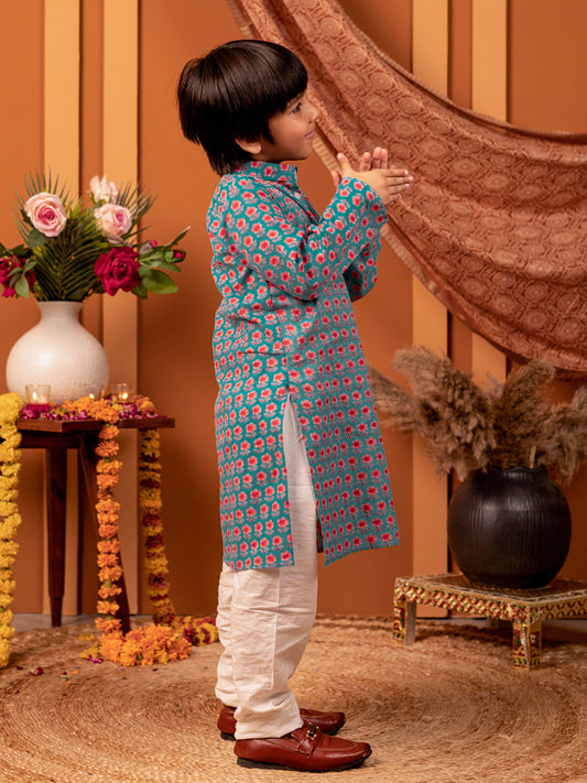 Boys Kurta Pyjama Printed Set in Cotton - Blue