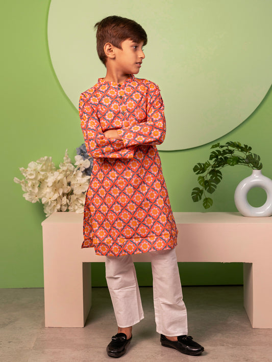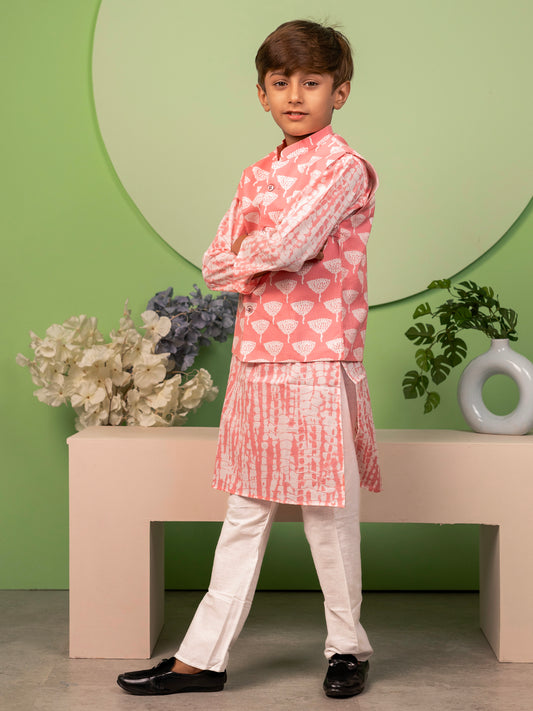 Boys Kurta Pyjama with Jacket in Handblock Print - Pink