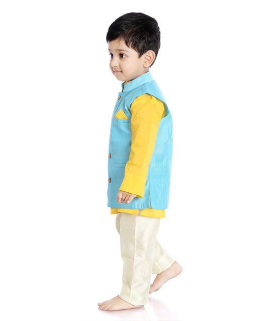 Boys Kurta Pyjama with Jacket in Handblock Print -Yellow