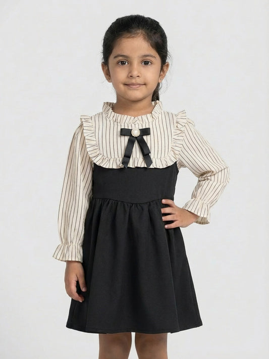Biglilpeople Girls Beige Ruffled Neck Full Sleeves A-Line Dress