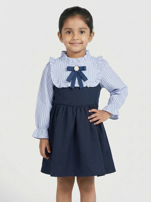 Biglilpeople Girls Blue Ruffled Neck Full Sleeves A-Line Dress