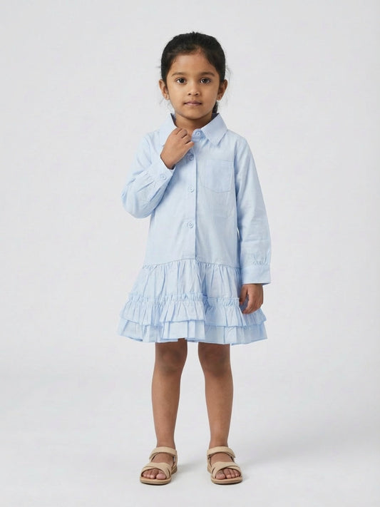 Biglilpeople Girls Blue Spread Collar Full Sleeves Drop-Waist Shirt Dress