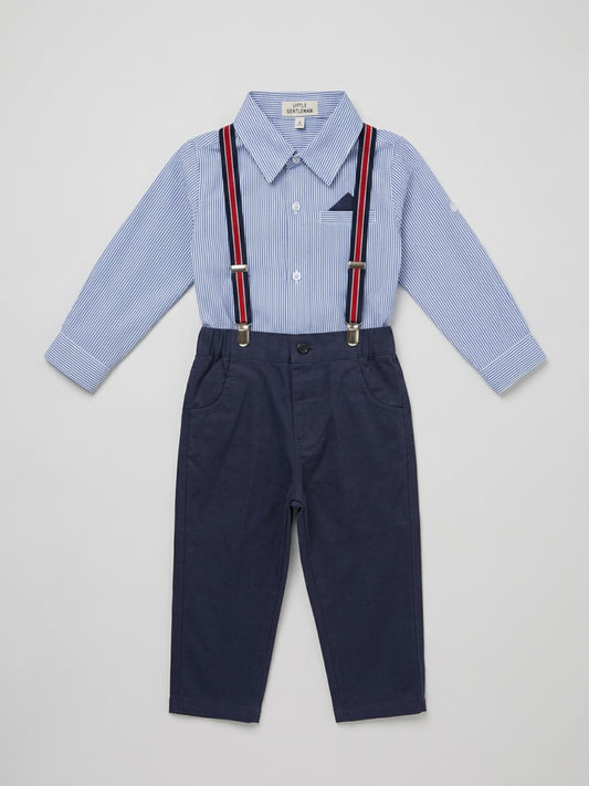 बिग्लिलपीपल लड़कों की नीली कमीज़ और पैंट सस्पेंडर्स के साथ