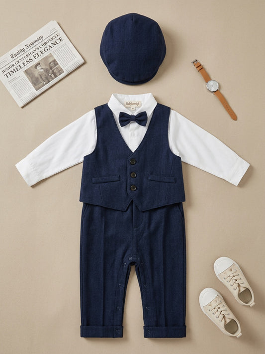 बिग्लिलपीपल लड़कों का 4-पीस सूट सेट: वास्कट के साथ शर्ट, सस्पेंडर्स पैंट, कैप और क्लासिक बो