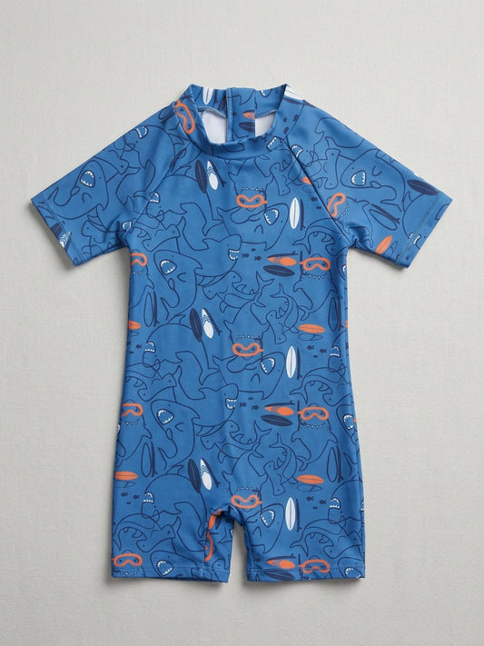 बिग्लिलपीपल लड़कों का नीला शार्क प्रिंट गोल गला छोटे आस्तीन वाला वन-पीस स्विमसूट