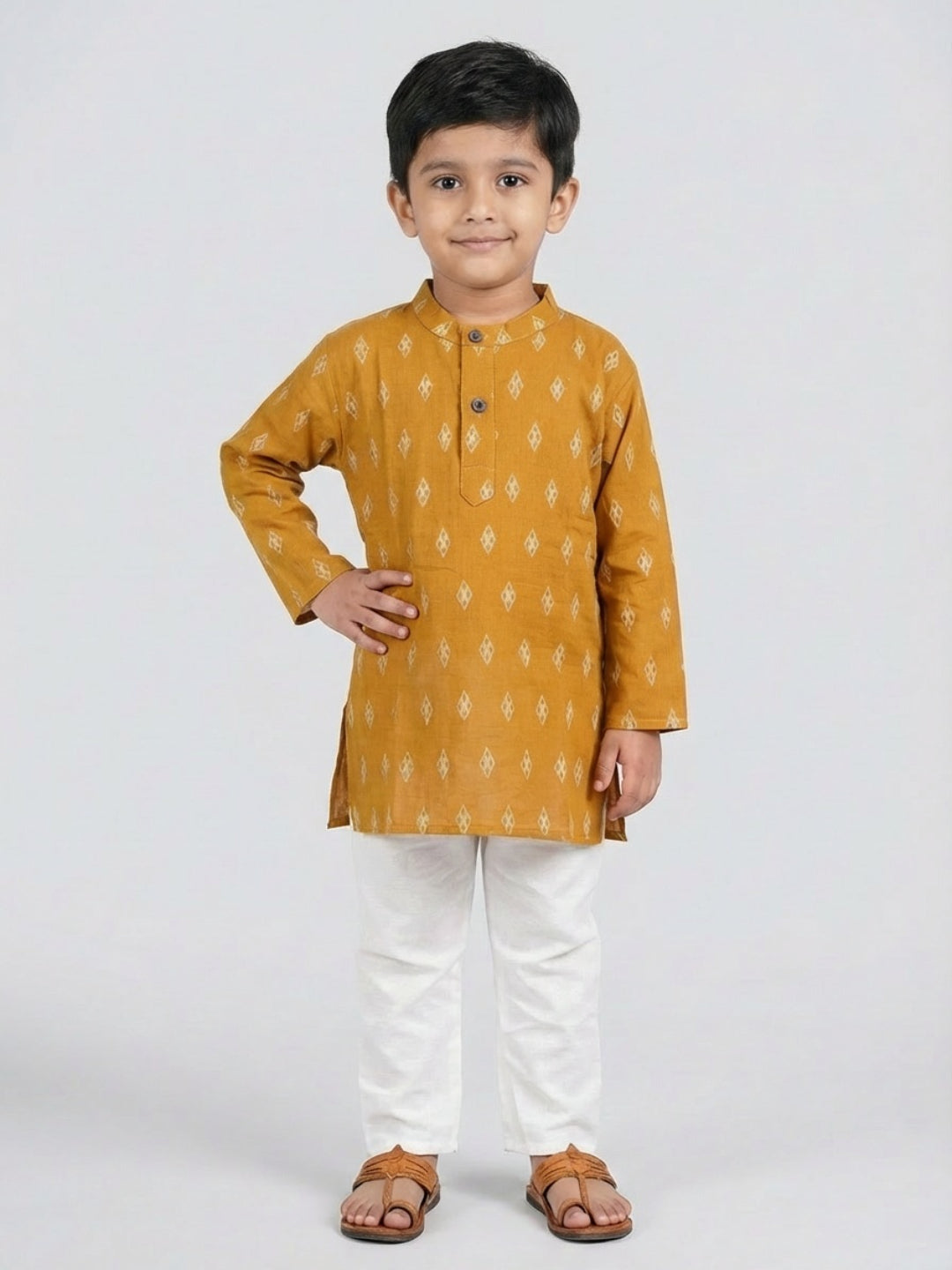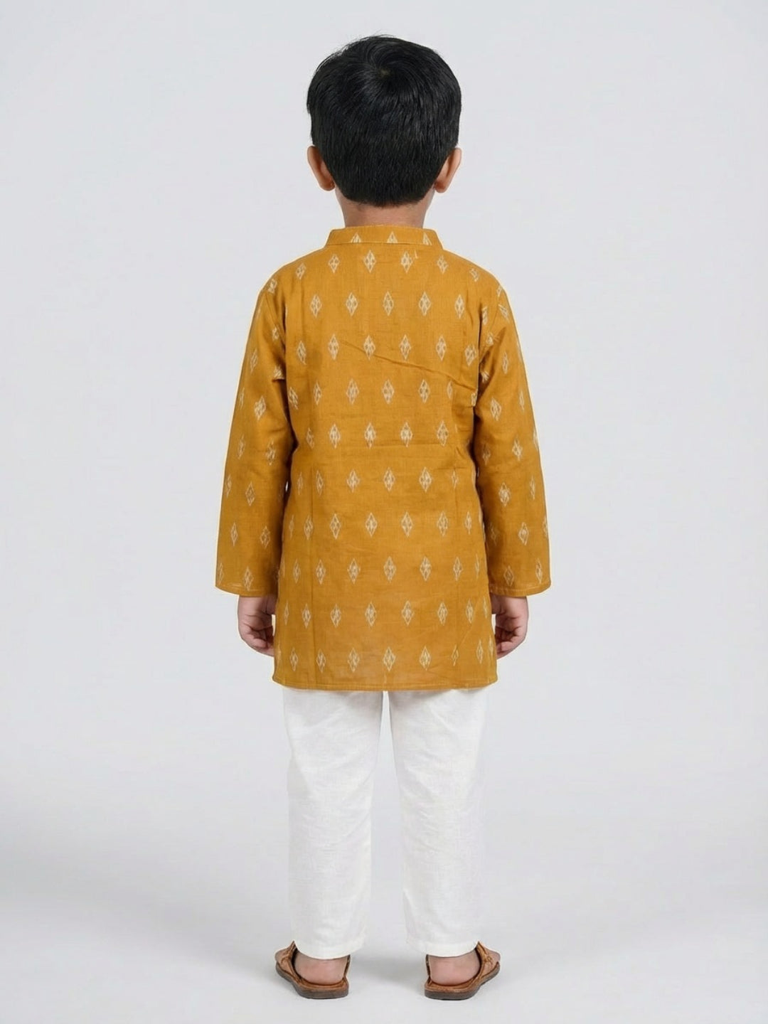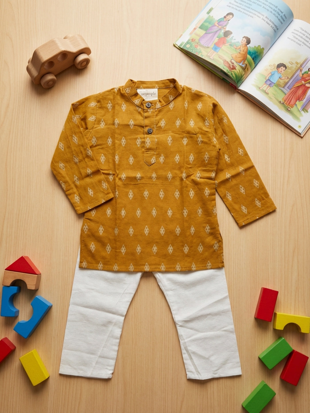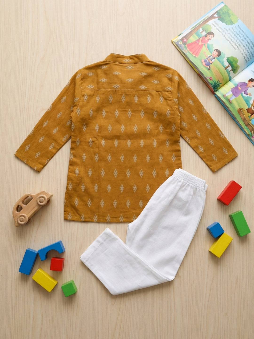 बिग्लिलपीपल लड़कों का मस्टर्ड येलो जियोमेट्रिक प्रिंट मैंडरिन कॉलर फुल स्लीव्स स्ट्रेट कुर्ता पायजामा सेट
