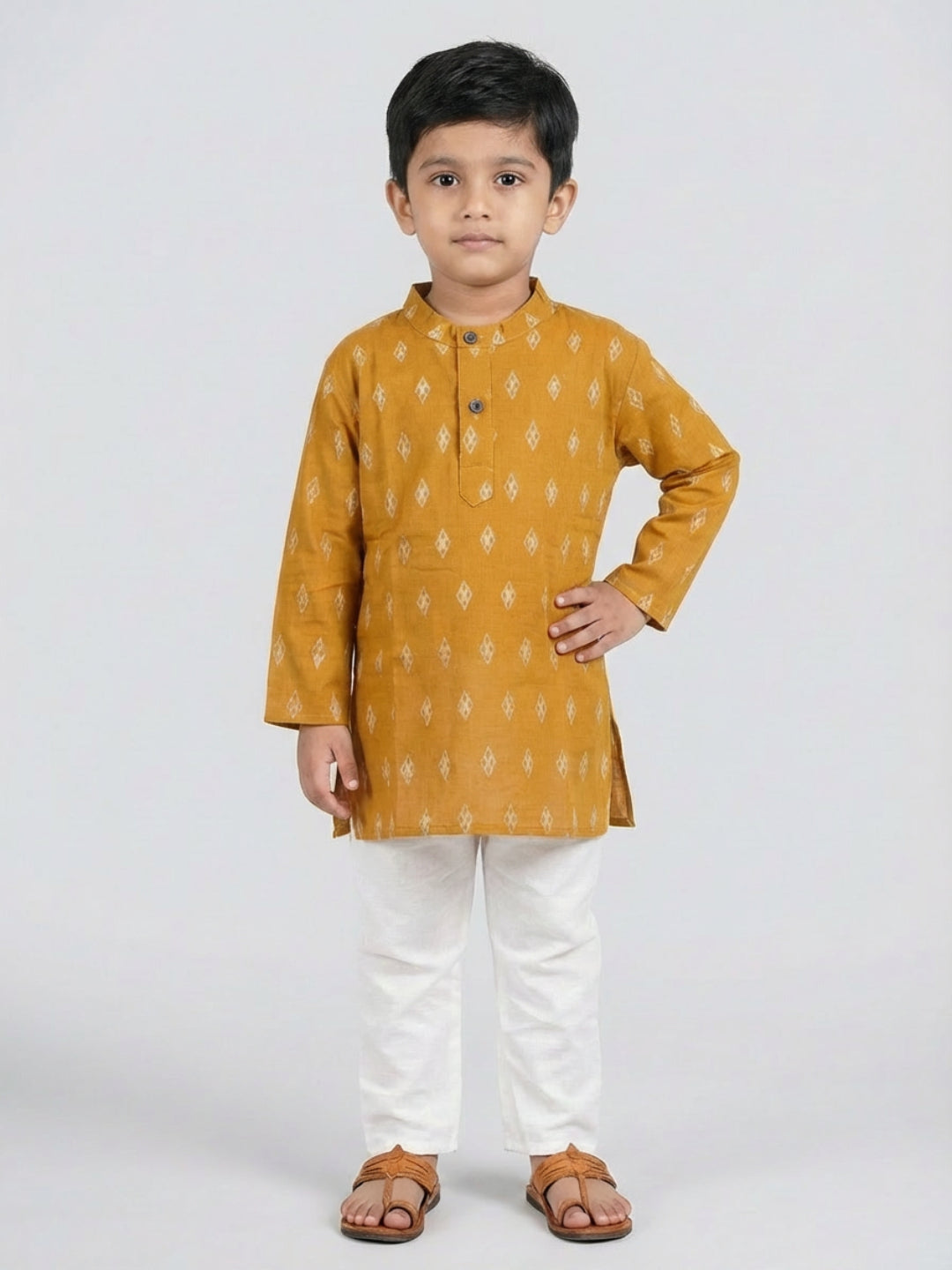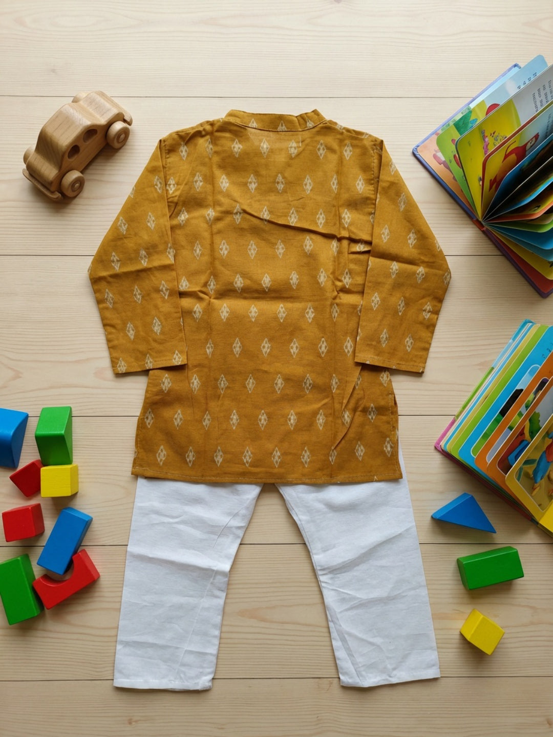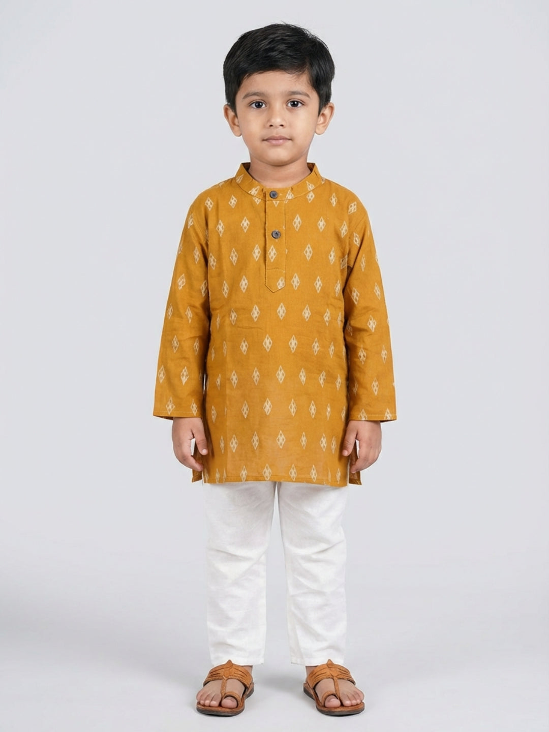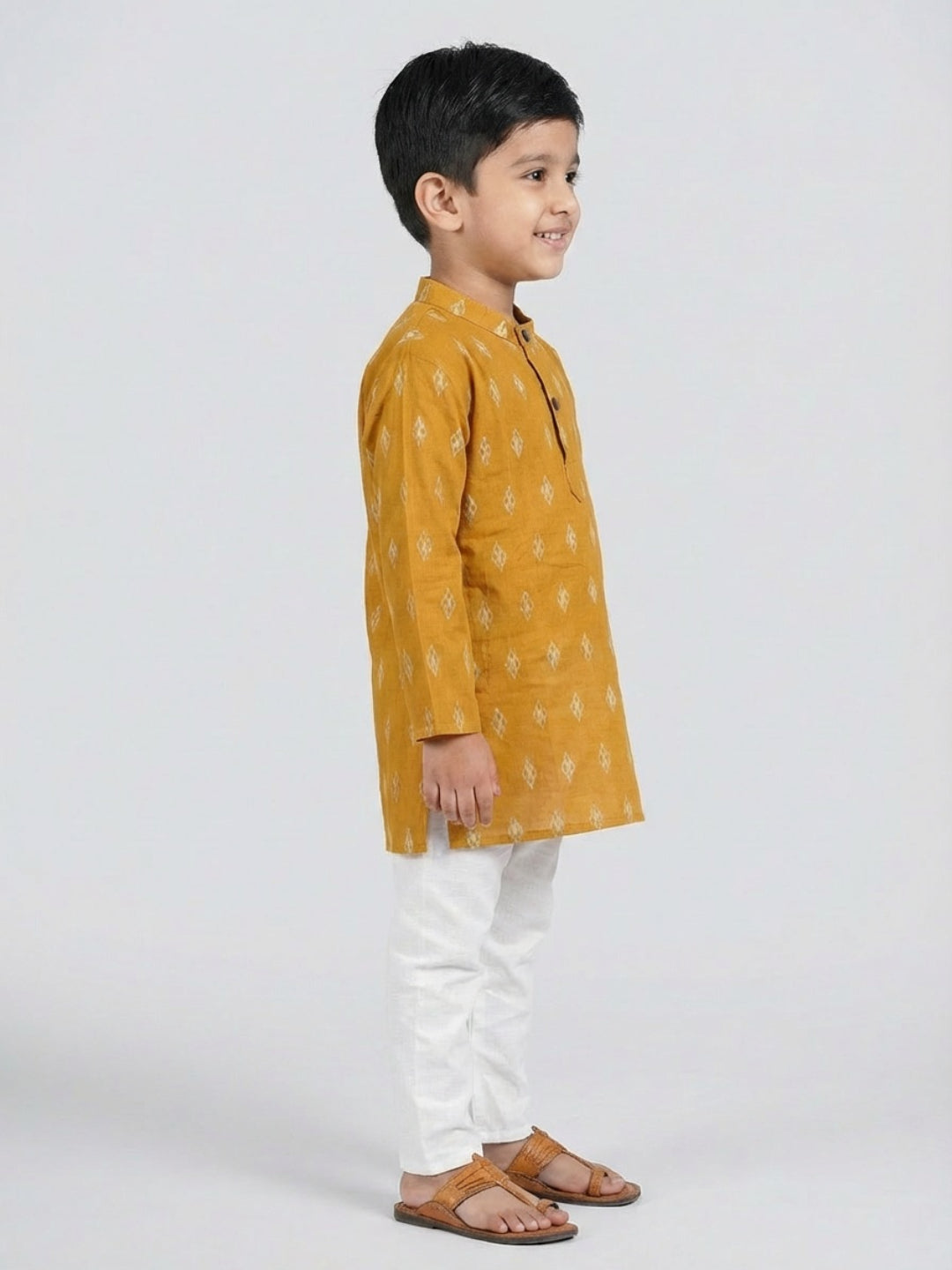 बिग्लिलपीपल लड़कों का मस्टर्ड येलो जियोमेट्रिक प्रिंट मैंडरिन कॉलर फुल स्लीव्स स्ट्रेट कुर्ता पायजामा सेट