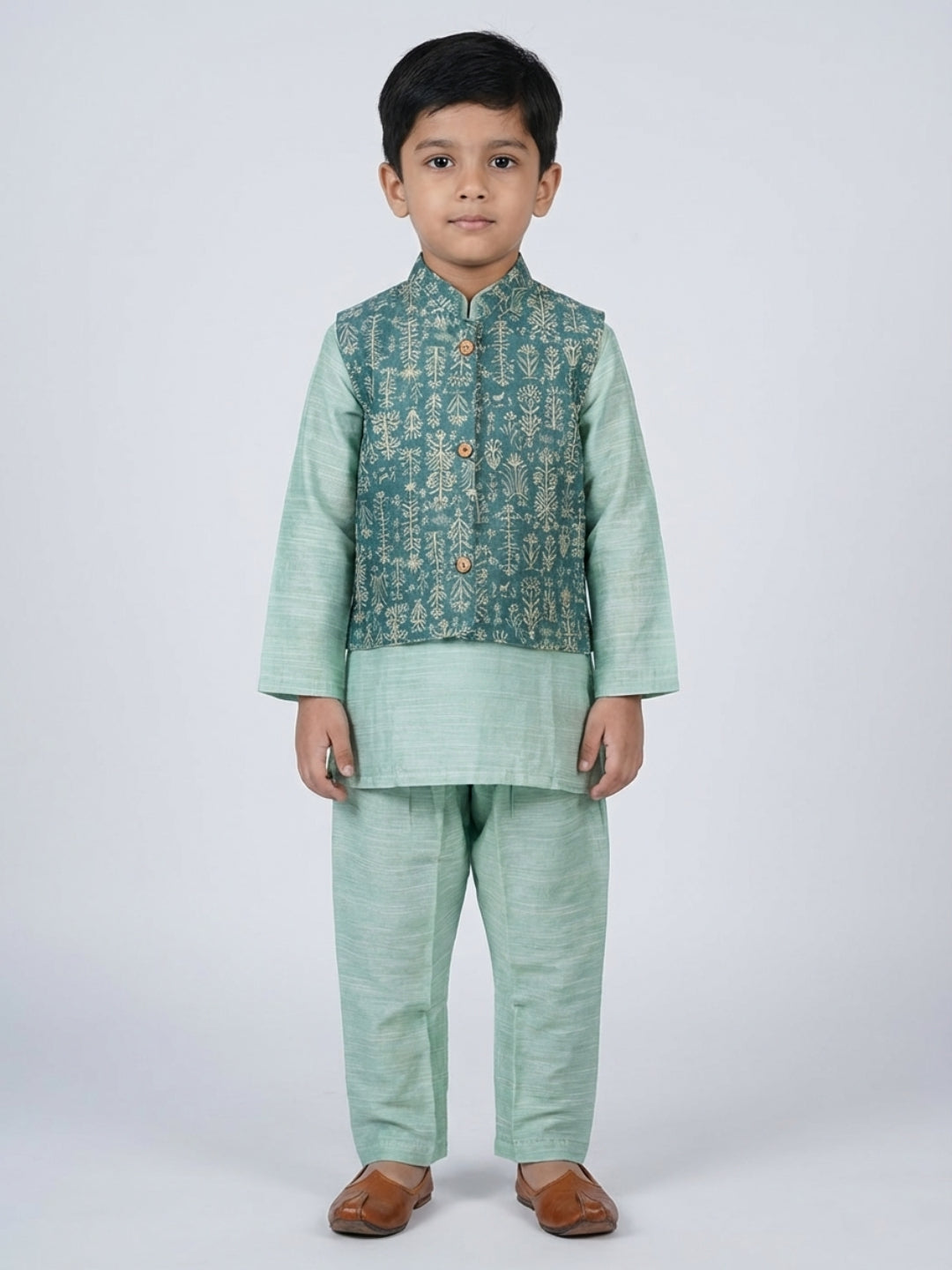 Give your young one a royal traditional look with this elegant ethnic kurta set. The outfit includes a printed kurta paired with a stylish floral Nehru jacket and a white churidar, perfect for festive and cultural celebrations. The jacket features intricate floral motifs and a mandarin collar for a refined touch, while the comfortable cotton-blend fabric ensures ease of movement all day long.