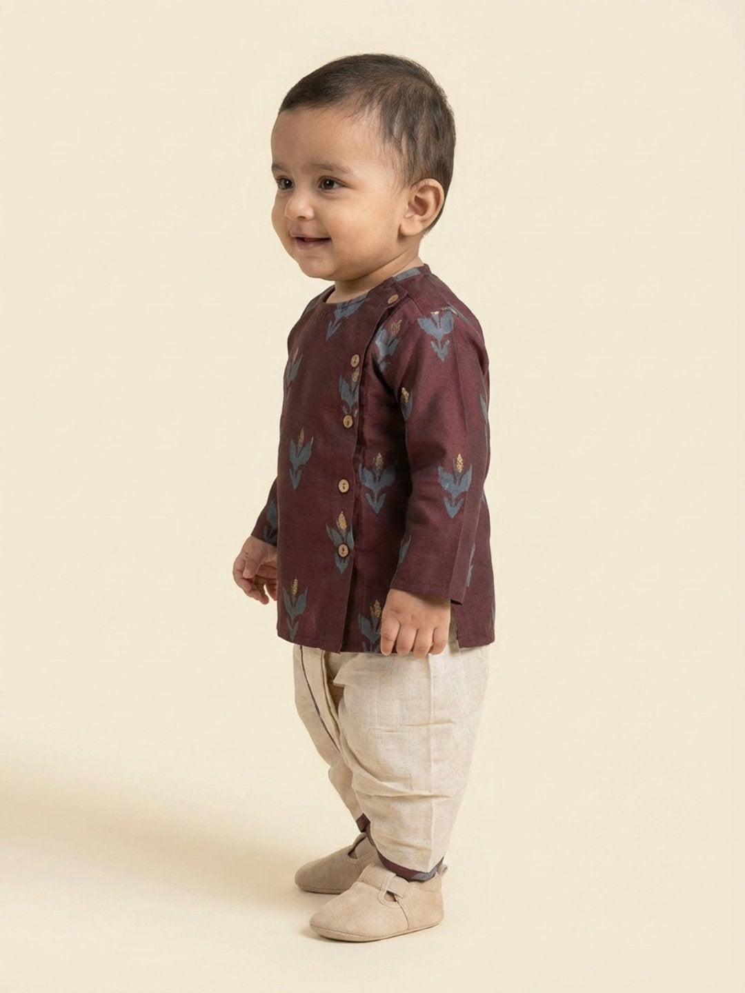 Add a traditional touch to your child's wardrobe with this kurta and dhoti pants set, designed for festive and cultural occasions. The round neck, full-sleeve angrakha-style kurta offers a classic silhouette, while the coordinated dhoti pants complete the ethnic look. Comfortable and easy to wear, this set is ideal for celebrations, family functions, and special events, combining traditional style with everyday comfort.