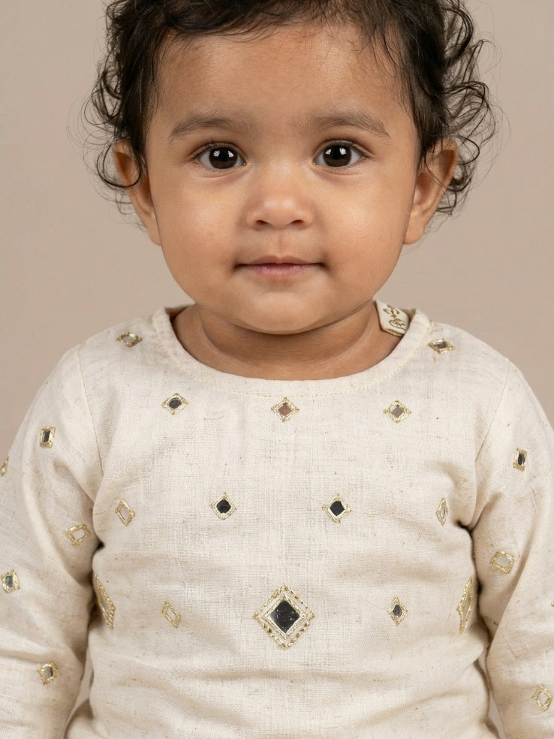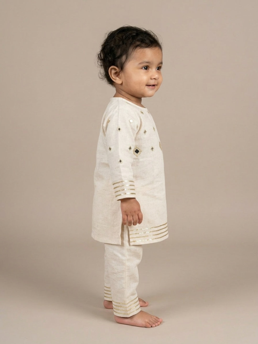 Keep your little one effortlessly graceful with this elegant off-white kurta pant set. Designed with subtle mirror work motifs scattered across the kurta, this outfit brings a soft festive shimmer without being overpowering. The straight-fit silhouette is enhanced with delicate golden stripe detailing on the sleeves, hemline, and pants, adding a refined traditional touch. Crafted in a lightweight, breathable fabric, this set ensures comfort while maintaining a polished ethnic look-perfect for festivals, family gatherings, weddings, and special celebrations.
