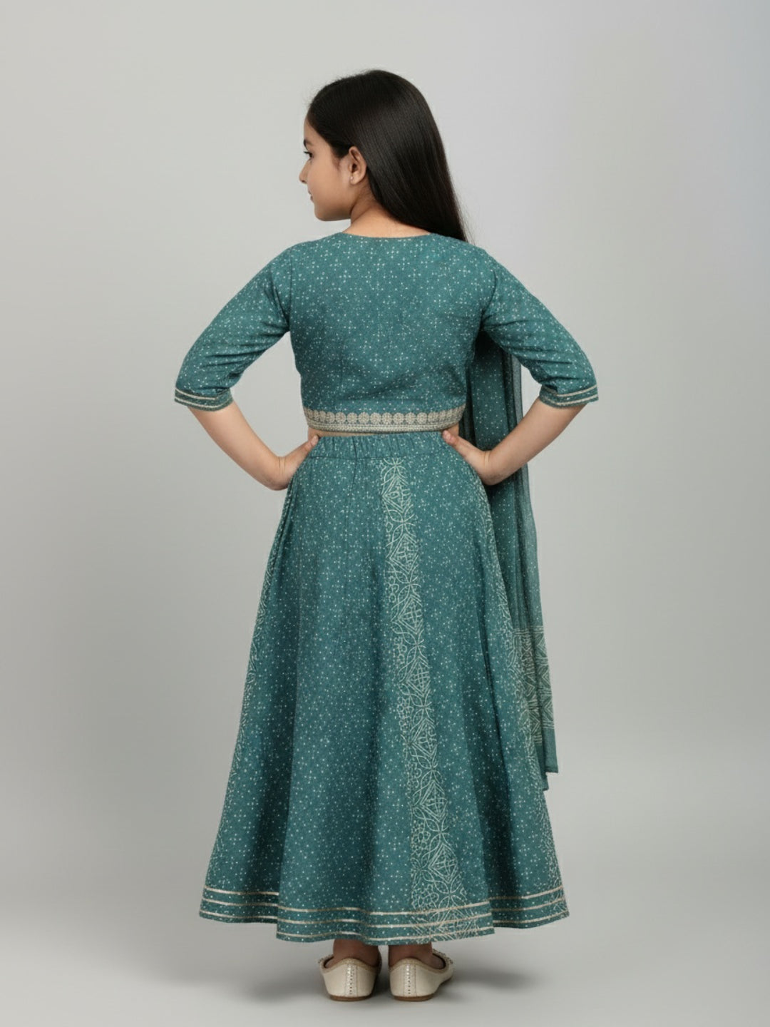 Dress your little one in timeless elegance with this beautiful ethnic lehenga choli set. The outfit features a V-neck crop top with half sleeves and intricate printed detailing along the neckline and borders. The matching flared lehenga is adorned with delicate traditional patterns, giving it a rich and graceful appeal. A coordinated dupatta with geometric border designs completes the ensemble, perfect for festive celebrations, weddings, or cultural occasions.